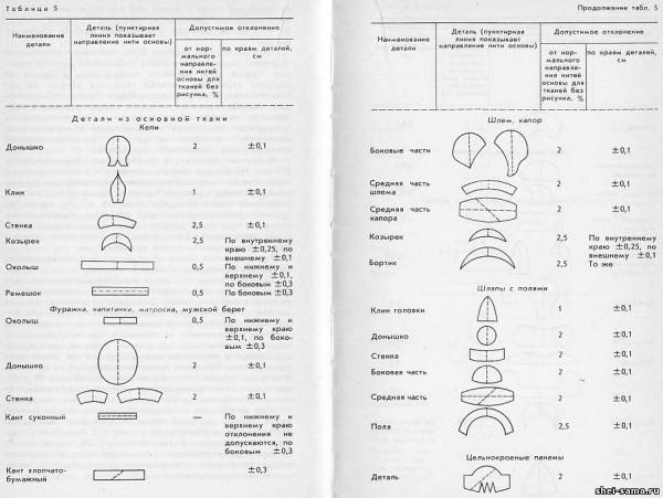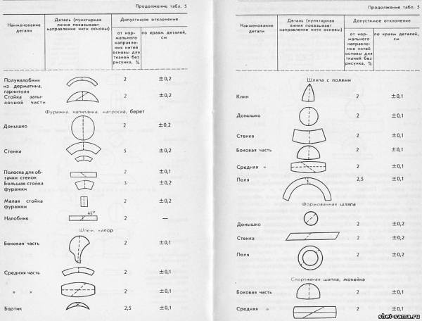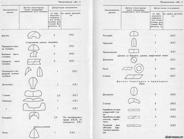 В головных уборах лекала подкладки чаще всего делают по лекалам верха, если шов стачивания шелковых подкладок больше шва стачивания верха. Если швы стачивания одинаковы, то деталь подкладки меньше детали верха на один размер. Если ткани верха, подкладки, прокладки не декатированы, то дают припуск с учетом усадки тканей. Если на лекалах верха имеются вытачки, то их делают и на лекалах подкладки. Направление вытачек на лекалах верха и подкладки должно быть одинаковым. В зависимости от обработки высота подкладки может быть больше или меньше. Если есть околыш, то детали подкладки длиннее (например, у матроски, берета и т. д.). А если край верха подогнут внутрь, то подкладка короче (например, в женских шляпах из ткани и меха, в мужских шляпах, кепи, спортивных шапках). Край подкладки располагают на одинаковом расстоянии от края верха. Это расстояние зависит от модели головного убора. Если детали подкладки той же формы, что и детали верха, то направления нитей основы и утка совпадают (см. табл. 5).