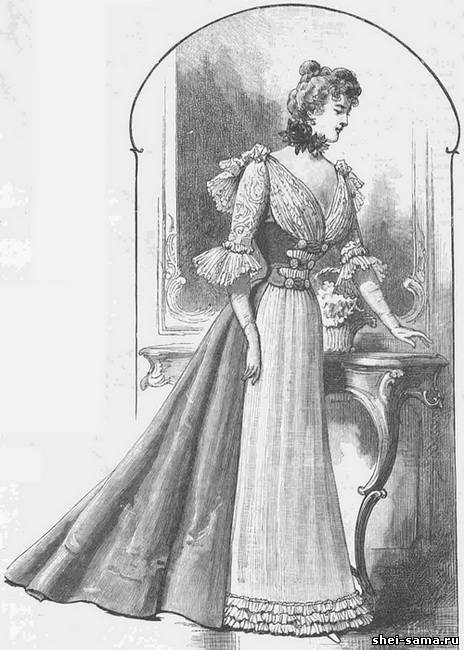 Декольтированное платье фасона принцесса шьётся из розового фая. Оно расходится спереди на сборчатой вставке из белого газа. Эта вставка отделана внизу тремя газовыми оборочками. Платье состоит из спинки без шва по середине и с косыми полотнищами по бокам для складок юбки, бочков спины и передков с вытачками, обозначающими бочка переда. Перед вырезается патами, которые застёгиваются красивыми пуговицами. Белая кружевная драпировка расположена в виде фишю. Обтянутая подкладка этой драпировки застёгивается спереди и соединяется с платьем швами под рукавами и на плечах. На спине расположена маленькая кружевная драпировка. Гладкий полудлинный рукав заканчивается плиссированным кружевом. Эти же кружевом украшен верх рукава.