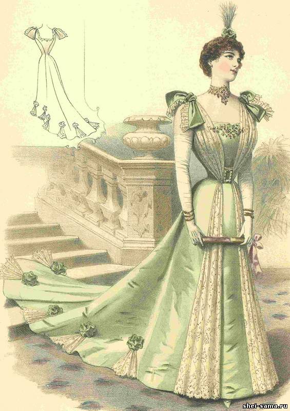 Требуется: 22 арш. атласа; 3 арш. бархата; 1 пряжка; 4 арш. кружевной материи; 7 арш. кружева шириной 20 см. и 8 арш. шириной 5 см.; 14 арш. волосяной ткани.