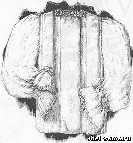 Летняя ночная рубашка шьётся из батиста или нансука. Обшивка шейного выреза и перехваты на рукавах делаются из прошивки валансьен или du Puy. Волан, которым заканчивается рукав, обшивается узеньким кружевом.