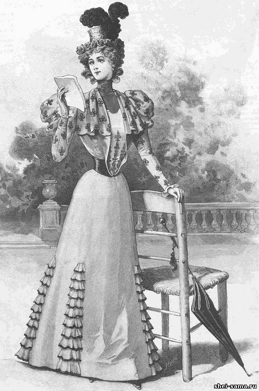 Платье для молодой женщины сшито из лёгкого светло-серого сукна. Юбка, состоящая из четырёх полотнищ, расходится на боках на вставках из той же материи. Эти вставки покрываются маленькими воланчиками. Корсаж состоит из цельной спинки и открытых передков, с разрезами на боках. В эти разрезы пропускается пояс-кушак из бархата древесного цвета, который застёгивается под пластроном из вышитого сукна. Этот пластрон украшается маленьким пластроном из зелёного бархата и накладывается на обтянутую подкладку корсажа, которая застёгивается спереди. Передки болеро из вышитого сукна плиссируются на плечах. Косой рукав из вышитого сукна подшивается подкладкой локтевого рукава. Бархатный воротник обшивается рюшкой из бархата. Золотой ток отделан зелёным бархатом и чёрными перьями.