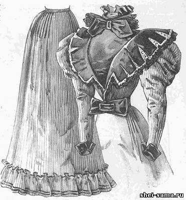 Городской туалет делается из полосатой зелёной шерстяной материи. Юбка состоит из четырёх полотнищ. Боковые полотнища сложены в мелкие складки, а заднее в круглые. Низ юбки украшается сборчатым воланом, обшитым чёрной бархатной ленточкой. Корсаж-блуза расходится спереди на широком пластроне из чёрной тафты. Спинка из одного куска декольтируется на кокетке из той же тафты. Зубчатая берта из чёрной тафты обшивается чёрным и белым кружевом. Волнистый воротник схватывается тафтяным галстуком с алмазной пряжкой. Такой же пряжкой схватывается бант на кушаке из тафты. Косой рукав украшен обшлагом из тафты. Низ рукава заложен в мелкие складки. Подкладка рукава с локтем. Обтягивающая подкладка корсажа застёгивается спереди.