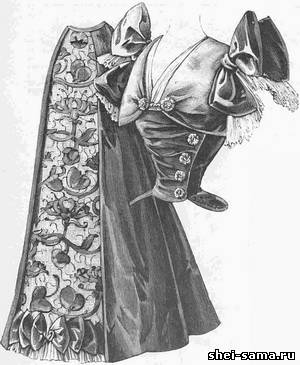 Платье для обеда сшито из атласа рубинового цвета и венецианского кружева. Юбка, состоящая из восьми полотнищ, расходится спереди на вышитой вставке, украшенной внизу воланом из муслина кремового цвета и бантами из чёрной тафты. Корсаж с сердцеобразным вырезом образует на боках маленькие баски. Он состоит из спинки, бочков спины и переда и передков. Правый передок драпируется и застёгивается большими пуговицами. Гладкая подкладка с выточками застёгивается спереди. Маленькое болеро из белого атласа сдерживается двумя старинными пуговицами. Оно подшито муслиновой драпировкой. Короткий рукав делается из плиссированного кружева и украшается большим бантом из чёрной тафтяной ленты.