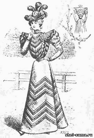 Платье для скачек шьётся из бархата фиолетового цвета. Юбка образует на боках несколько волнистых складок. Она отделана тесьмой, которая расположена ломанными линиями. Подкладка корсажа состоит из спинки, бочков спины и переда и передков с вытачками. Верхняя материя состоит из спинки без шва и передков, которые скрещиваются налево. Красный атласный пояс-кушак вышит стеклярусом. Корсаж отделан тесьмой также как юбка. Косой рукав из одного куска подшивается подкладкой локтевого рукава. Кокилье и эполетки из тёмно-фиолетового бархата обшиваются тесьмой. Сборчатый воротник обшит рюшкой из красного бархата.