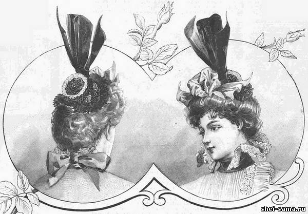 Маленький капот, вышитый стеклярусом, снабжён тульей Шуберский, обшитой рюшкой из кружева крем. Вокруг пасса расположены четыре больших мотива из бирюзы и алмазов. Сбоку виднеется высокая эгретка из чёрного бархата. Край пасса обшит плиссированным чёрным тюлем. Спереди расположено большое драпированное шу из ленты бирюзового цвета.