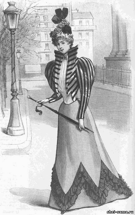 Костюм из вуали орехового цвета декорируется чёрной атласной лентой. Юбка, состоящая из пяти косых полотнищ, декорируется внизу двумя сборчатыми оборками из ленты № 16. Оборка расположена большими зубцами. Фигаро обшито лентой № 5. Оно выкроено из одного куска. Перед вырезан и отогнут реверами, которые соединяются с прямым воротником. Кофточка расходится на сборчатом жилете из розового газа. Жилет располагается на обтянутой подкладке корсажа, которая застёгивается спереди. Рукав из одного куска подшивается подкладкой локтевого рукава. Прямой драпированный воротник из газа. Ток из королевских роз отделан чёрной бархатной эгреткой.