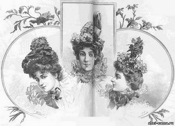 Капот "Ян". Красивый капот из зелёной соломы состоит из четырёхугольной тульи из соломы фантазия и пасса, покрытого розовыми розами трёх или четырёх оттенков и тускло-жёлтыми. Слева виднеется эгретка из резеды, а внизу эгретки шу из листьев и резеды.