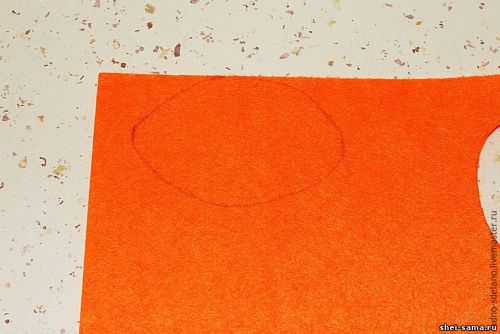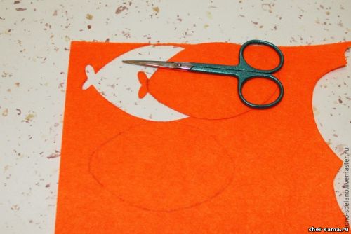 Обводим на оранжевом фетре тело рыбки и ее губы, второй раз обводим только овал тельца. Рисовать лучше всего карандашом или мелом, так как их проще всего вывести при необходимости. Теперь приступим к работе с красным фетром. На нем нужно обвести и вырезать только отдельно губки рыбы.