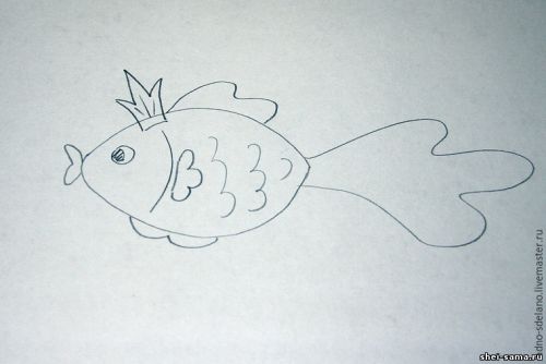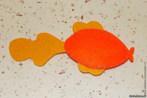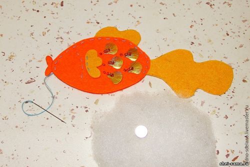 Дошиваем уже набитое тельце рыбки по нижнему краю. Перед набивкой стоит приклеить небольшой магнитик изнутри к задней части тельца рыбки. Не забудьте так же во время прошивания вставлять на необходимые места плавники и хвостик рыбки. Губки, глаз и корону приклеиваем с помощью клеевого пистолета. Вот и все, наша чудо-рыбка готова и будет всегда вас радовать и исполнять желания.