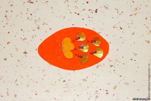 Перед тем, как собирать полностью нашу игрушку, необходимо будет украсить ее деталями. Первым делом в двойном сложении голубой нитью прошиваем обыкновенным стежком линию, которая будет отделять голову от тельца. Той же нитью пришиваем по краю боковой плавник. Далее будем делать чешую из выбранных пайеток.