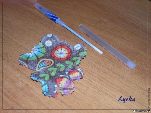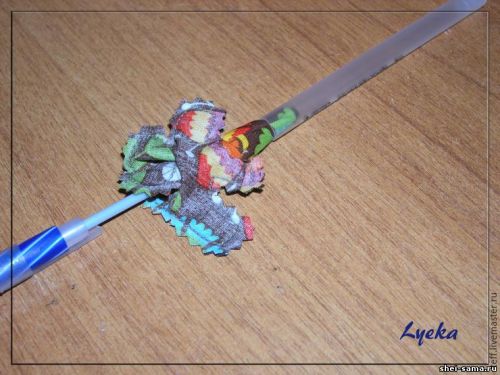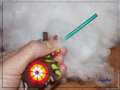 Приступаем к набивке брелока пухом или другим подходящим материалом, для этого можно использовать тот же стержень от ручки.