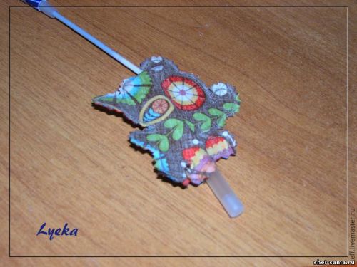 Полая часть ручки вставляется в изделие до конца. С другой стороны, через материал вставляем стержень в ручку.