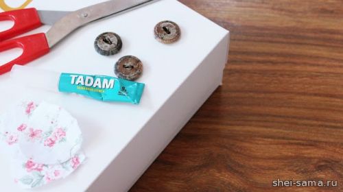 18. Возвращаемся к пуговицам. Обклеиваем их небольшими кусочками ткани (здесь использовался клей Тадам!)