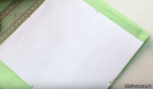 Когда квадраты полностью вырезаны, кладем их друг на друга. Нужно сделать засечки, приложив лекало для удобства, в средней точки с всех сторон на расстоянии 10,5 см. По засечкам будет видно, где нужно будет сделать складочку.