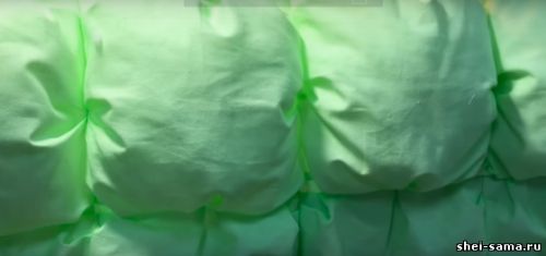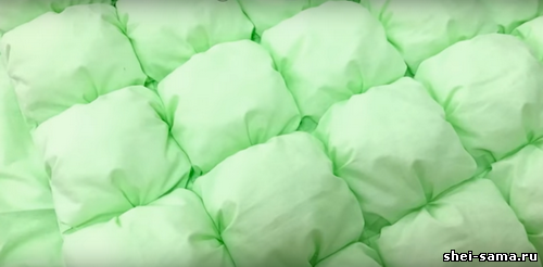 Наполняем наши бомбоны. Бамбоны не должны быть плотно заполнены, поэтому нужно брать две ладошки наполнителя в каждый квадрат. Заполненные бомбоны по ряду начинаем на швейной машинке прострачивать. Когда во всех рядах бомбоны будут наполнены и сшиты вместе, то можно сказать, что одеяло почти готово.