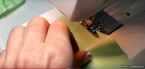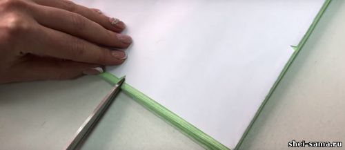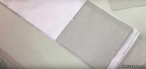 Затем вырезать из ткани. Берем ткань, желательно хлопок, складываем ее в два слоя по самой широкой стороне, равняем, для того, чтоб квадраты были одинаковыми. На ткань ложем лекало площадью 441 см², обрисовываем кусочком мыла и вырезаем полоски.