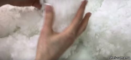 Начинаем наполнять квадраты. Для начала нужно холофайбер немного помять для большей мягкости, так как на заводе его прессуют и складывают в пакеты.