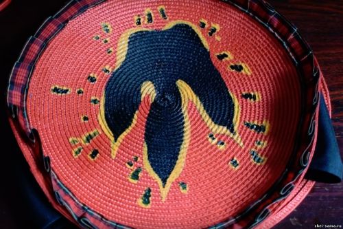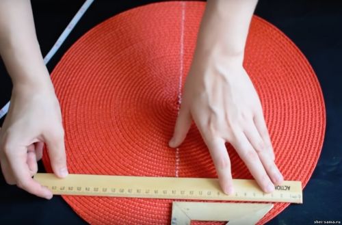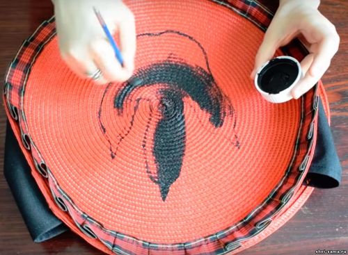 Для того, чтобы сделать летнюю соломенную сумку, я беру две красные полипропиленовые салфетки по 38 сантиметров и черную ткань, напоминающую ткань для рюкзаков.