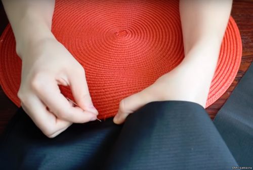 Теперь я приметываю боковую часть к салфетке. Это довольно неудобно делать, потому что нитка постоянно цепляется за салфетку, то завязываются узелки, то нитка вообще рвется.