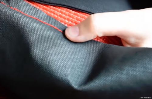 Это будет задняя часть сумки. Пришиваю все на машинке. Нижнюю нитку я вставила красную, а верхнюю черную, чтобы ничего не выделялось. Снимаю обметку.
