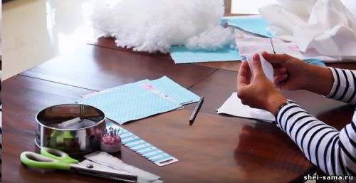 Итак, мы вырезали квадраты. Теперь для того, чтобы нам было проще шить, совмещать складочки на верхних и нижних квадратах, мы поставим на каждой стороне квадрата надсечки. Для этого мы будем складывать каждый квадрат по каждой стороне пополам, и ставить маленькую надсечку длиной примерно 2-3 миллиметра.