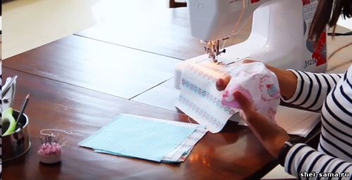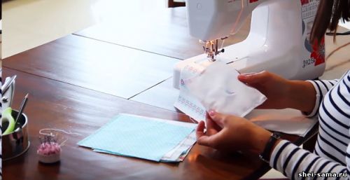Кладем большой квадрат на маленький и делаем несколько стежков, затем совмещаем серединку на маленьком квадрате и на большом, излишек закладываем в складку и прострачиваем ее.