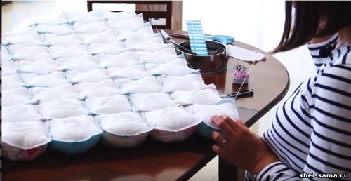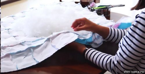 Чтобы наполнить каждый квадратик необходимо по 20 грамм холлофайбера на один квадрат. Наполнять очень легко – просто запихиваем наполнитель в через отверстие, распределяем сначала по углам квадрата, а потом уже по серединке.