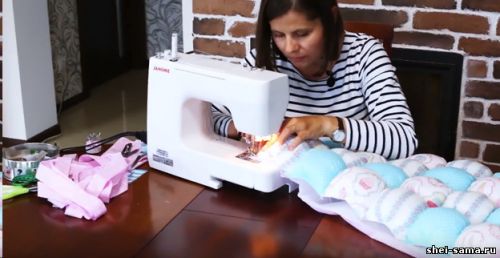 Готовую деталь мы соединяем с полотном из квадратов с синтепоном и прострачиваем по краю стежком 2-3 миллиметра.