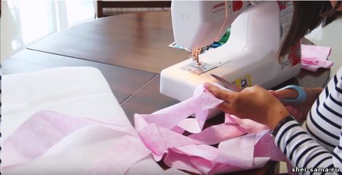 После этого нам необходимо, чтобы детали составляли из себя одну длинную полосу. Для этого складываем их перпендикулярно, так как показано на картинке. Строчить будем от угла к углу по диагонали.
