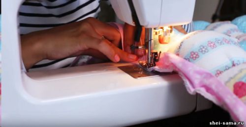 Сейчас нам необходимо соединить выкроенный синтепон и нижнюю деталь из хлопка. Накладываем хлопок на синтепон с припуском 2-3 миллиметра. Таким образом мы прошиваем все четыре стороны.