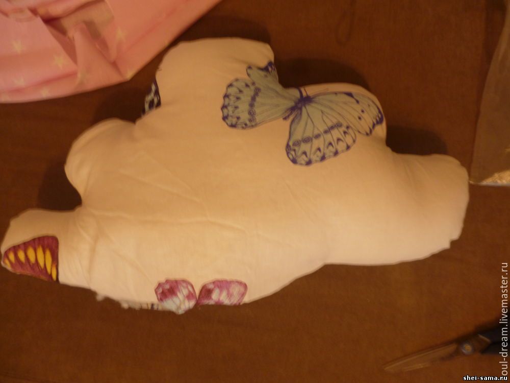 Материал для наполнения помещается внутрь синтепоновой основы. Стоит внимательно относиться к заполнению краев облаков. Оно должно быть плотным. Это позволит подушке держать форму, а наполнитель никуда не исчезнет во время ее использования в последующем.