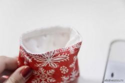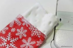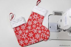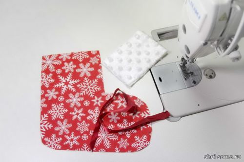 Наши носки изготовлены из хлопчатобумажной ткани красного цвета с белыми снежинками, с добавлением белой миньковой ткани. Все это может быть выполнено из велюра, флиса или хлопка в сочетании с искусственным мехом. Вам также понадобится лента, шнурок или веревка, чтобы повесить.