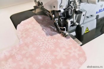 Складываем две вырезанные формы носков вместе лицевой стороной, соединяем булавками и пришиваем на машине, оставляя верхний край (отверстие) не пришитым. Обметываем шов на оверлоке.