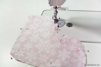 Скрепляем булавками все части нашего рождественского носка - отверстие носка с изнаночной стороны к лицевой стороне белого Минки, а между ними добавляем ленту, которая будет нашей вешалкой. Сшиваем все вместе.