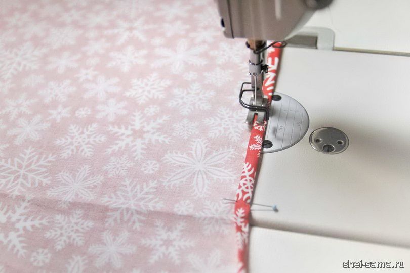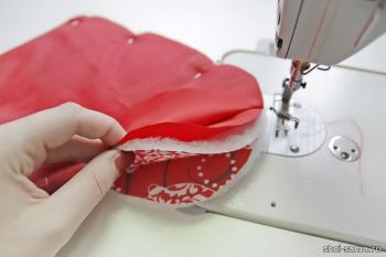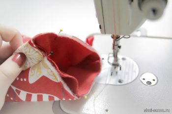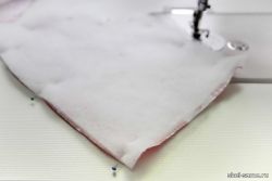 Две сшитые таким образом детали кладут лицевой стороной вместе, а подкладку сверху, также лицевой стороной внутрь, и плотно скрепляют булавками. Все слои прошиваем на машинке.