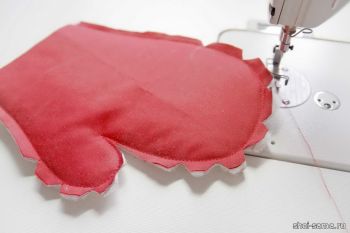 После шитья разрежьте перчатки на закругленных местах и между большим пальцем, это позволит сформировать более красивую форму при вывернутом наизнанку изделии.