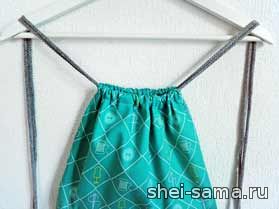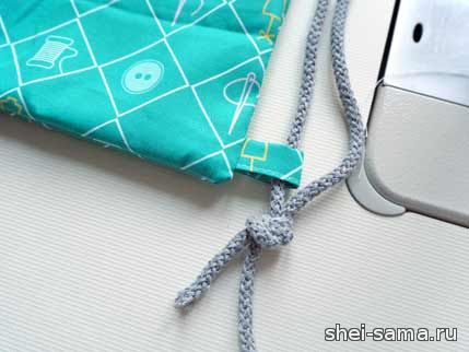 Продеваем веревку через полоски внизу мешочка и делаем петлю.