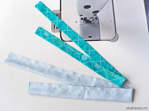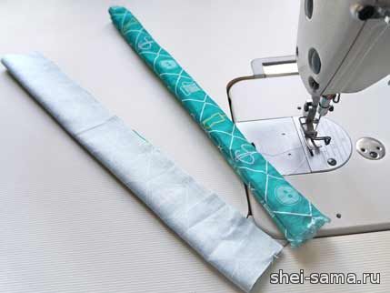 Сложите полоски пополам более длинными краями и прострочите их на 1 см, затем выверните их, например, английской булавкой, и прогладьте их с лицевой стороны.