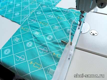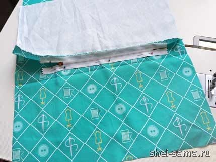 Пришло время сшить карман. Обметайте его верхнюю часть оверлоком, а затем пришейте к ней одну сторону молнии ровно посередине.
