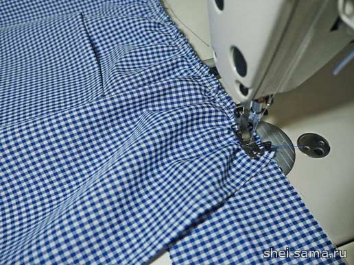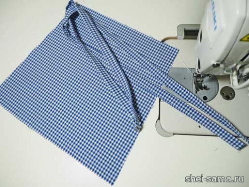 Нижнюю часть слегка морщу на нити вверху. Отмечаю середину и прикрепляю к ней ремешок, который перед этим тоже прогладила пополам. Пришиваю полоску к левой стороне фартука, а затем прошиваю полоски. Обрезаю углы и переворачиваю все на лицевую сторону.