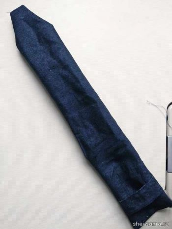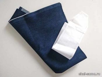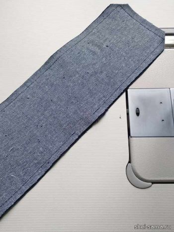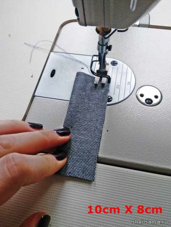 Чтобы закрыть корпус, нам понадобится элемент размером 10 х 8 см, который будет прямоугольным. Складываем пополам более длинными сторонами друг к другу и сшиваем. Затем выверните его наизнанку и прошейте. Для шитья такой толстой джинсовой ткани лучше всего сменить иглу в машине на более толстую, чтобы она не сломалась.