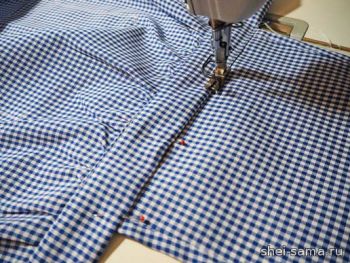 К лицевой стороне пришиваю верхнюю часть фартука ровно посередине. Затем покрываю весь шов полосой и прошиваю.