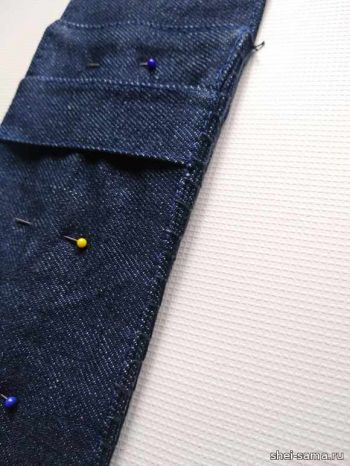 Время кармана. Загибаю верхний край до 2 см и зашиваю. Остальные края прикалываем к центру на 1 см и проглаживаем, чтобы было удобнее расположить их на фартуке.
