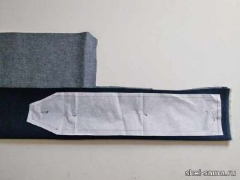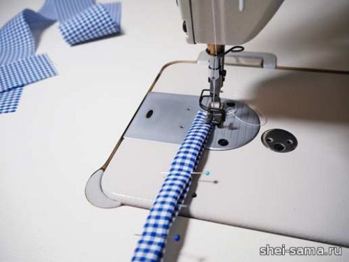 Прошитый поясок кладем между двумя слоями футляра по более широкому краю и застрачиваем.