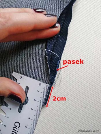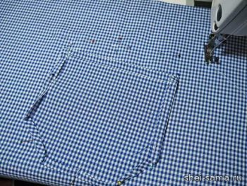 К отверстию кармана пришиваю шнурок, а затем зашиваю весь карман в отмеченном месте на фартуке.