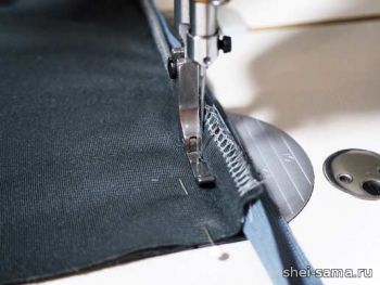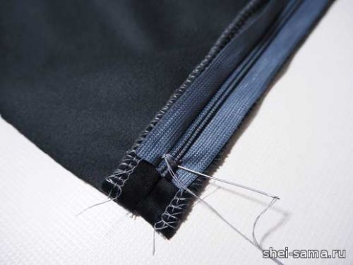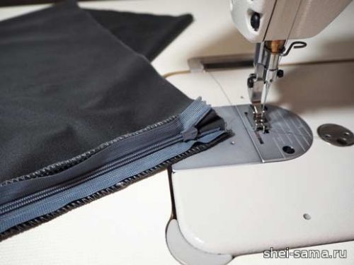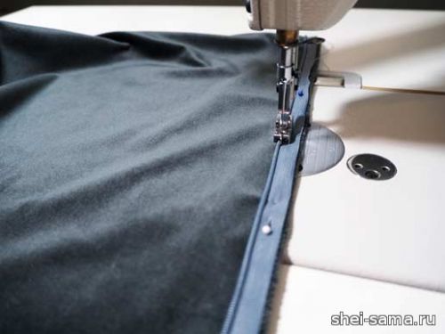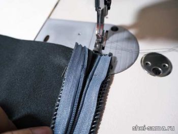 В начале и в конце молнии, в том месте, где мы закончили ее пришивать, пришейте ткань. Лучше всего делать это односторонней лапкой, тогда эффект будет точнее и легче выполнить.