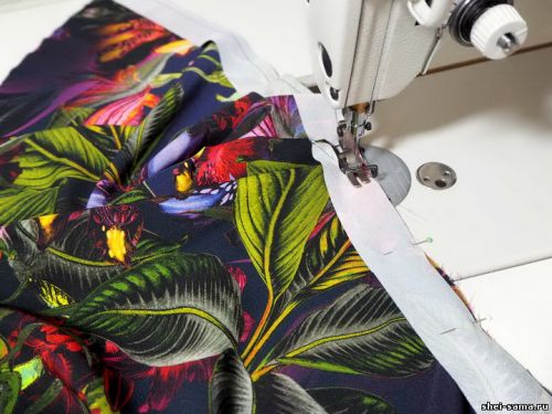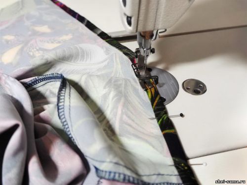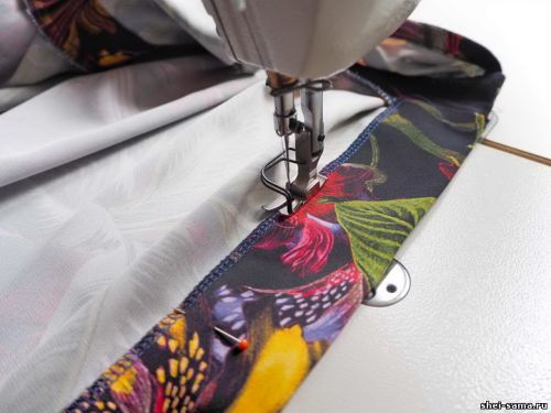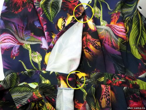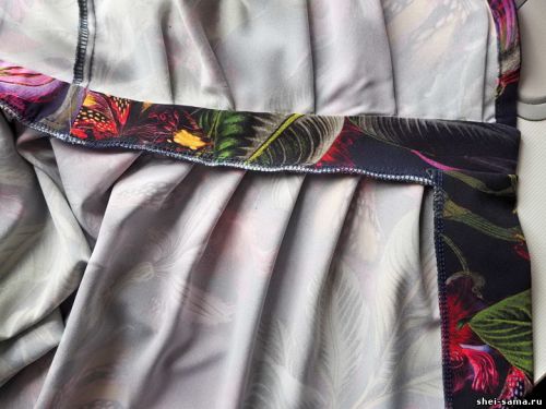 Шаг 14: Пришейте нижнюю часть пояса к верху платья и соедините с низом. Здесь тоже располагаем язычки, обметываем весь шов на оверлоке.