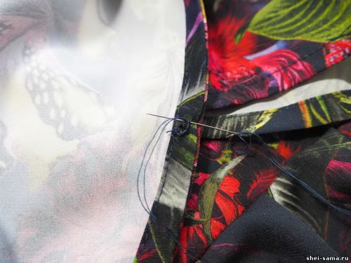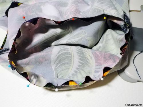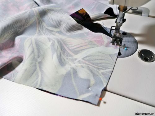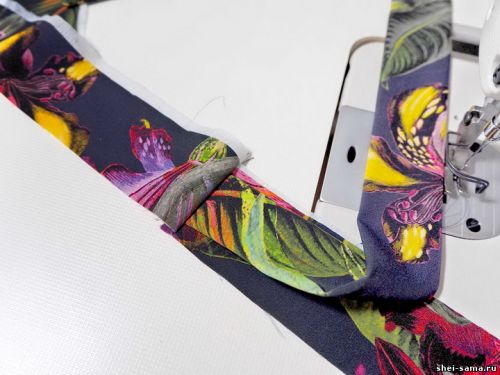 Шаг 7: Вырез платья завершаем диагональной складкой, пришиваем ее лицевую сторону направо.