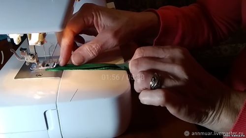 После прошивки, не обрезайте нить, а вытяните её из машинки, чтобы остался длинный конец. Его необходимо продеть в иглу с большим ушком, а саму иголку аккуратно просуньте через всю прошитую заготовку, на которой заранее подрежьте получившийся припуск.